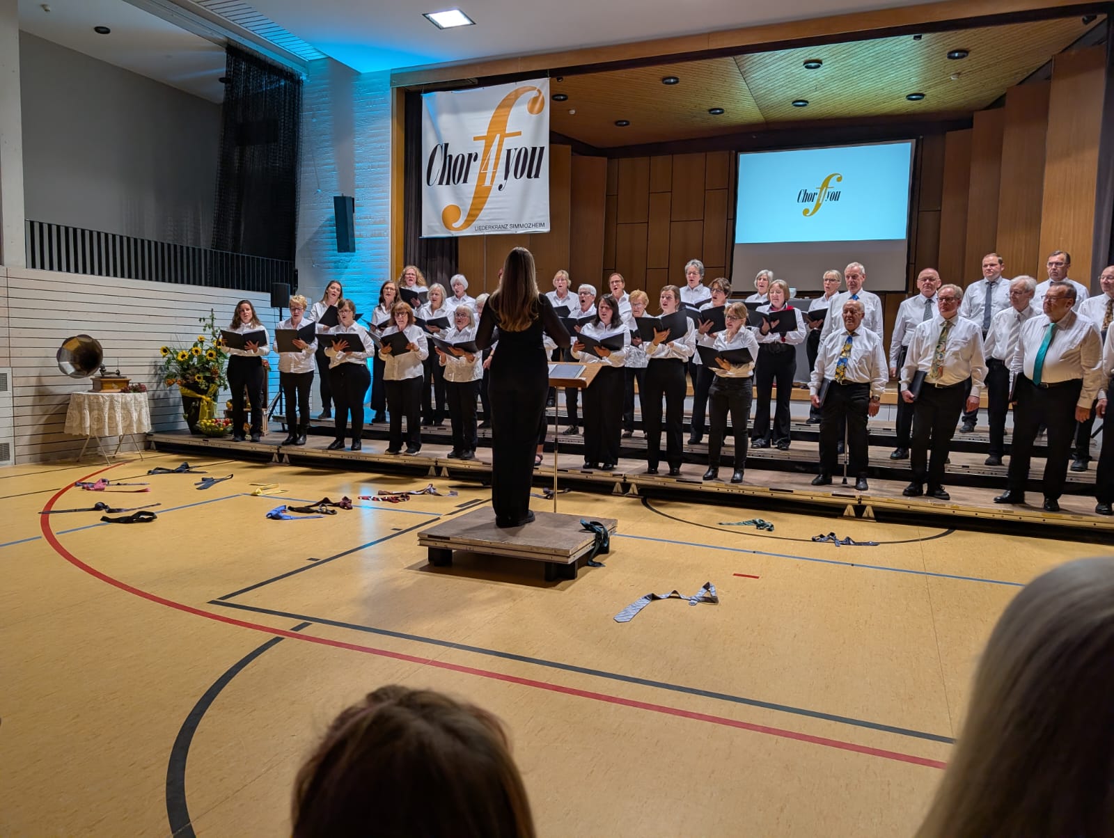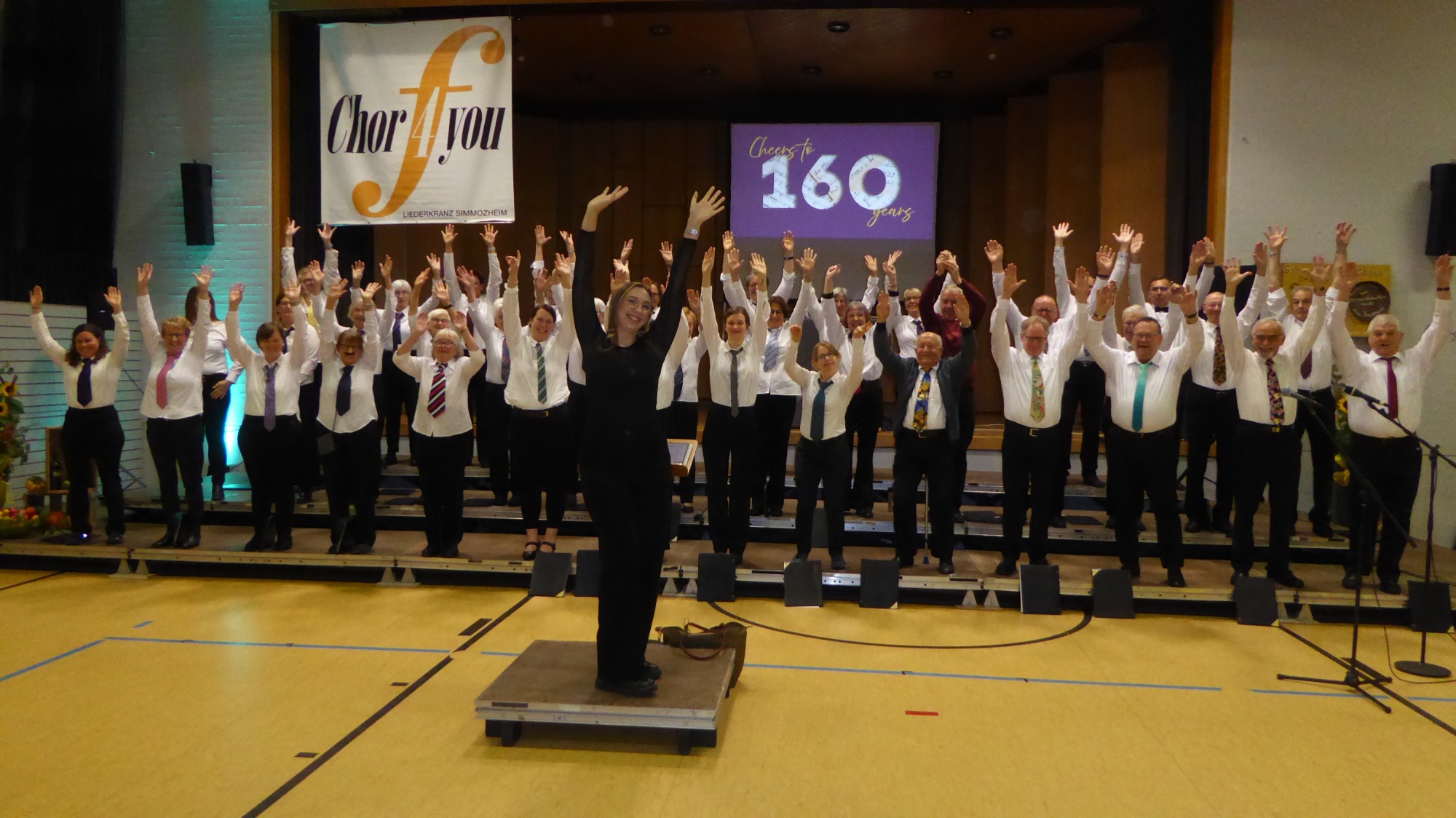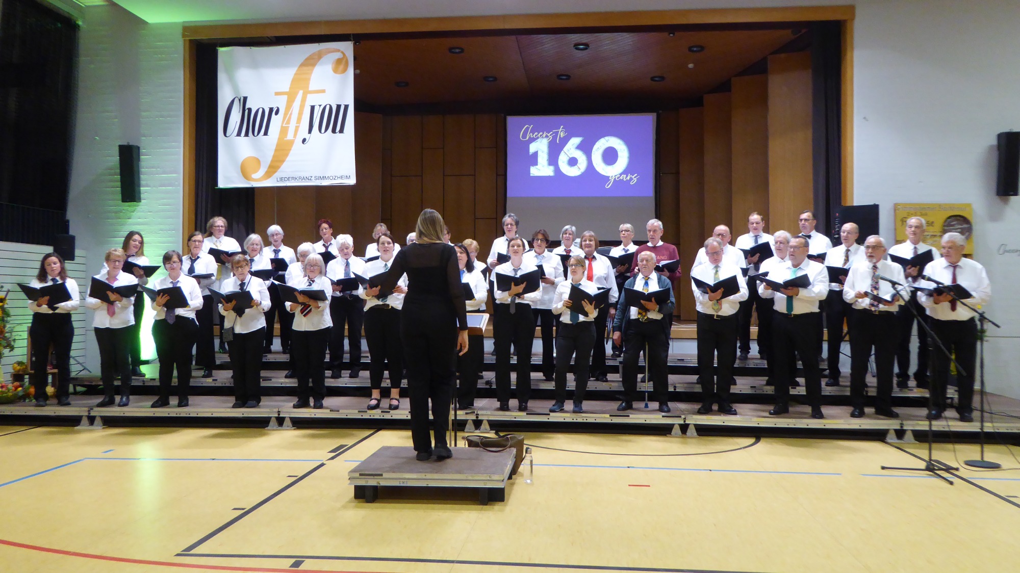 Bis zum letzten Platz war die Geißberghalle an diesem Abend besetzt, als wir unter dem Motto "Cheers to 160 years" unser 160-jähriges Bestehen feierten. Mit einem abwechslungsreichen Programm, das musikalische Highlights aus verschiedenen Epochen und Stilrichtungen vereinte, nahmen wir unser Publikum mit auf eine Reise durch die Geschichte des Chorgesangs. Die Freude am Singen war allen anzumerken und die Stimmung im Saal war einfach großartig.